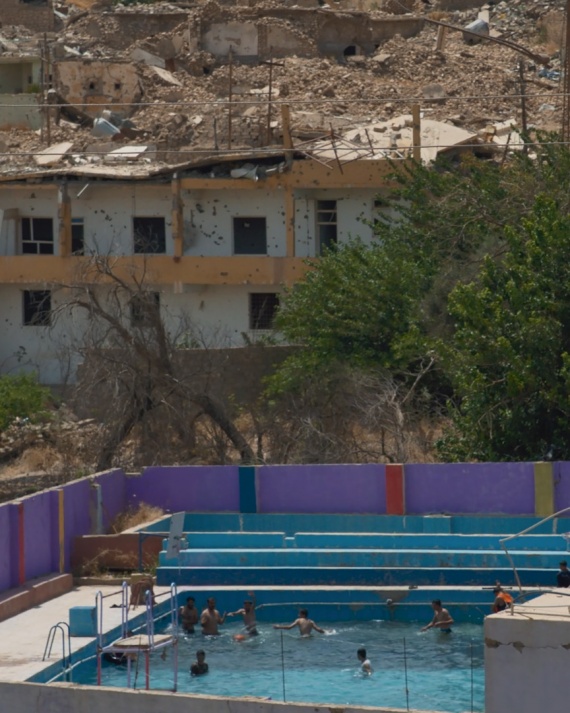 Così, una città bombardata si lascia “colorare” da una piscina e dalle risate di giovani che nuotano. Un campo profughi anela a trasformarsi in una città normale, dove si ordina una pizza a domicilio dalla propria tenda, o ci si riunisce per guardare una partita di calcio assieme agli amici.
