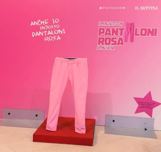 Il teatro era sold-out. Nel foyer, prima e dopo lo spettacolo, si formavano file davanti al cartonato con i pantaloni rosa: tutti volevano una foto con quel simbolo che da motivo di scherno è diventato segno di consapevolezza.