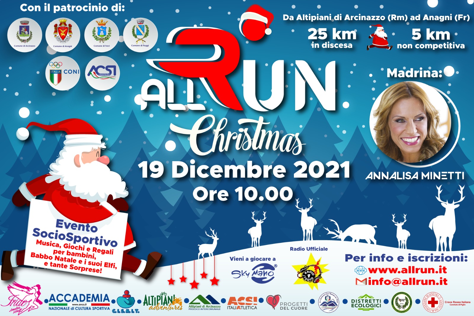 Alla dichiarazione di Luca Marocchi fa eco quella del primo cittadino di Anagni Daniele Natalia che ha dichiarato: “Aver dato il Patrocinio del Comune di Anagni ad un evento come “All Run Christmas” ci riempie d’orgoglio in quanto si tratta non solo di un importante evento sportivo ma anche di un grande evento sociale. Aiutare i bambini ospiti delle case famiglia del nostro territorio, far conoscere le meraviglie della nostra terra, far sì che lo sport ancora una volta svolga il suo ruolo naturale di aggregatore sociale e comunitario, sono questi gli obiettivi degli organizzatori di “All Run Christmas”, Annalisa Minetti e Davide de Luca, che ringraziamo ed ai quali ci associamo. Il 19 dicembre Anagni ed Arcinazzo Romano saranno protagoniste di questa bella manifestazione che è sport, solidarietà e divertimento. Sarà un successo assicurato”.