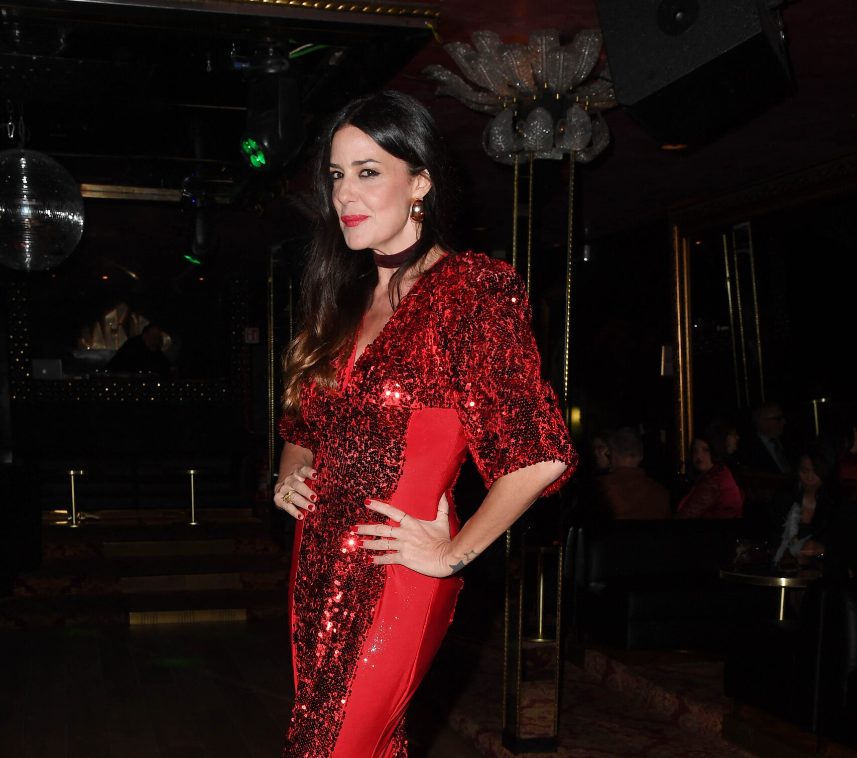 Lungo abito rosso di paillettes e rossetto scarlatto per Alessia Fabiani, in splendida forma, scortata come sempre dall’amico Giuseppe Bambagini.