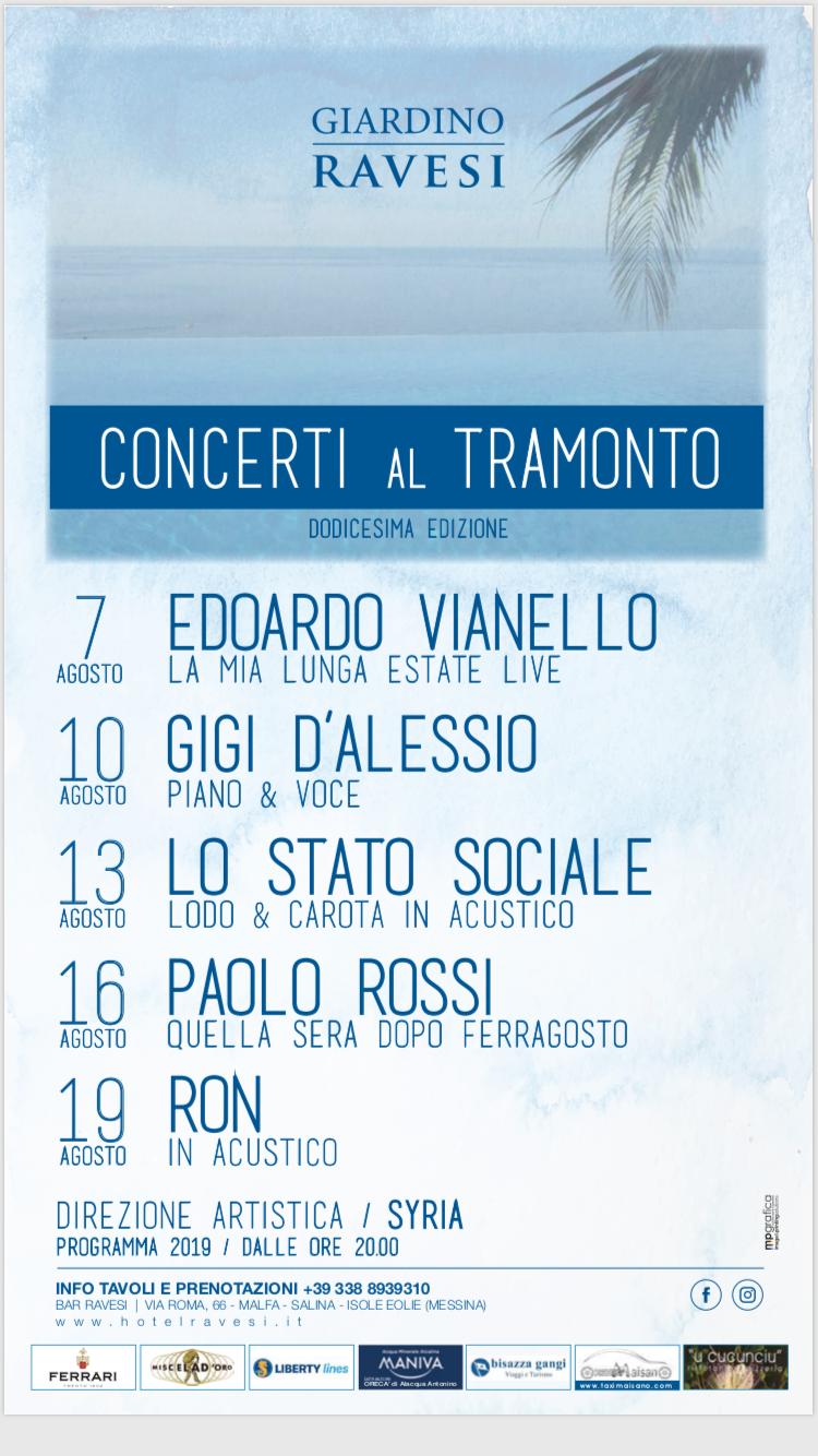 È tutto pronto per la 12^ edizione della rassegna CONCERTI AL TRAMONTO al Giardino Ravesi di Salina dal 7 al 19 agosto.
