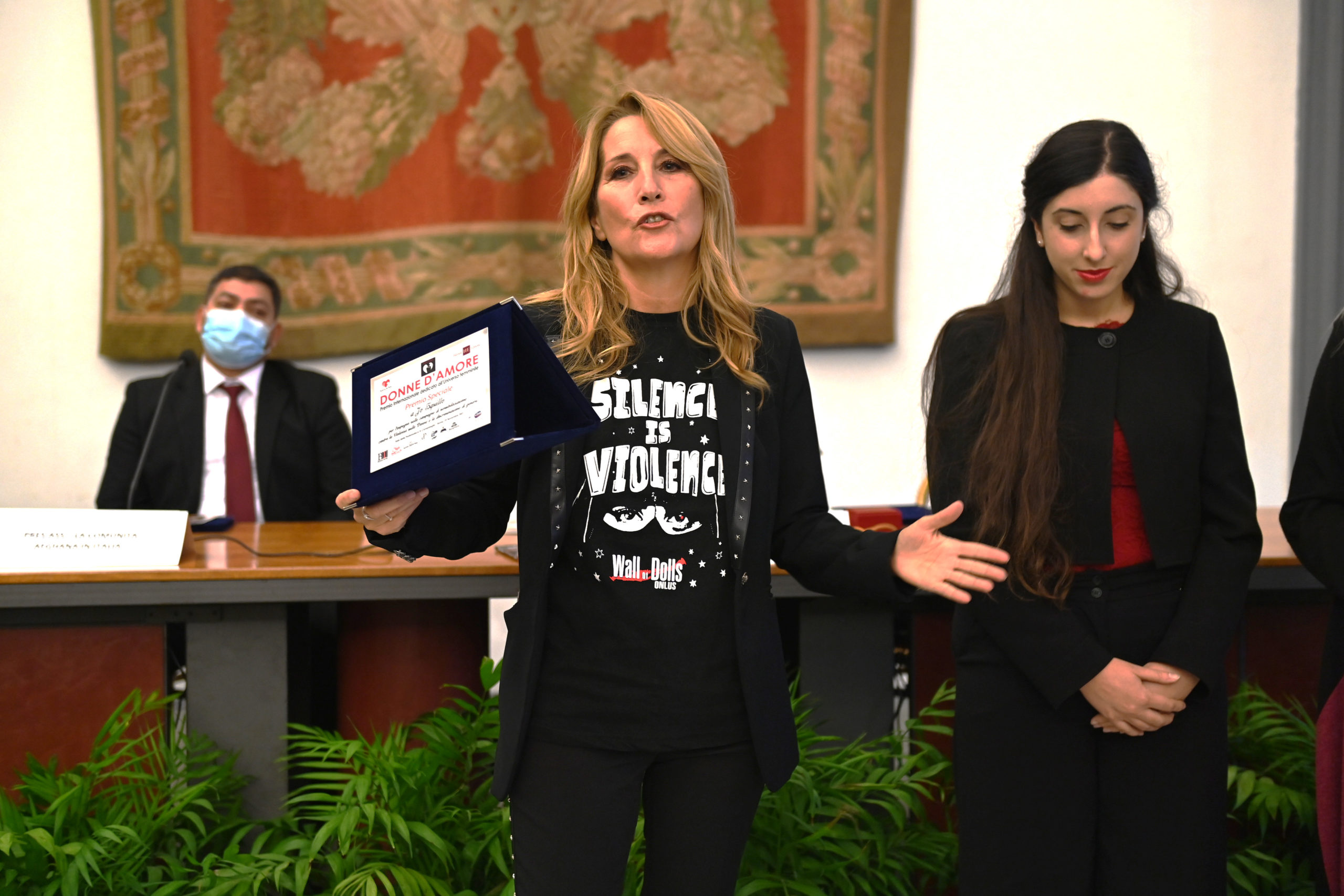 Al termine degli interventi sono stati premiati artisti provenienti da tutto il mondo che hanno partecipato al Premio Internazionale “Donne d’Amore” in varie sezioni. Francesca Alotta e Jo Squillo impegnate in campagne di sensibilizzazione contro la violenza sulle donne, hanno ricevuto un premio speciale per il loro lavoro di artiste attiviste: la prima ha commosso il pubblico interpretando l’indimenticata Mia Martini , mentre la seconda ha presentato il nuovo documentario della sua Onlus Wall of Dolls dedicato proprio alle ragazze costrette a matrimoni combinati. Premio speciale anche all’Associazione Nazionale Centrailsogno di Palombara Sabina (RM) – Gestione del Centro anti violenza nella Casa della Salute.