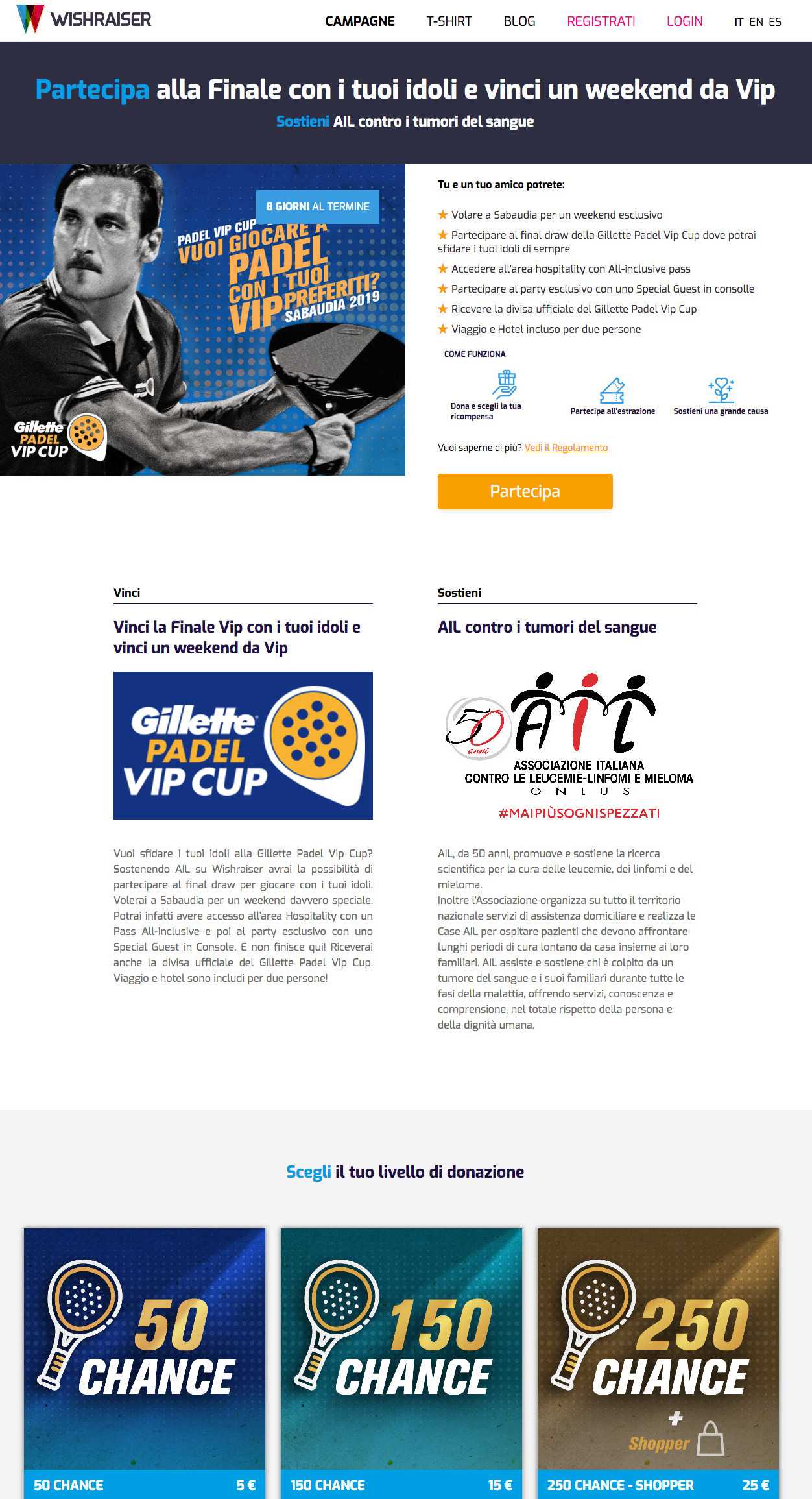 Da oggi la campagna è on-line su WISHRAISER – www.wishraiser.com/it/campaigns/padel – con la modalità donare per vincere: sulla piattaforma è stato messo in palio un week-end per assistere alla Gillette Padel Vip Cup; ogni utente, attraverso una donazione, potrà partecipare all’estrazione per vincere viaggio e soggiorno a Sabaudia, i vip pass all-inclusive per la finale del torneo, la possibilità di giocare con i propri idoli in campo e accedere a un party molto esclusivo con le celebrities.
