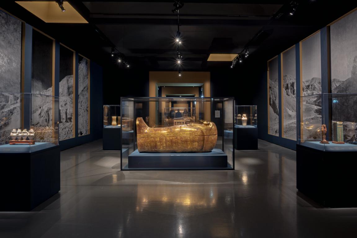 Uno dei momenti più suggestivi del percorso espositivo è la sala del sarcofago ligneo dorato. Qui la luce diventa racconto puro: «Volevamo che il sarcofago emergesse dalla penombra», racconta Murano. Un taglio di luce radente, orientato con precisione millimetrica, ne valorizza riflessi e dettagli pittorici, mentre tutto il resto resta volutamente in silenzio visivo.