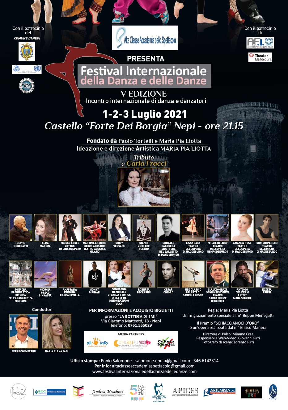 Giovedì 1 luglio si dà inizio a Nepi, alla quinta edizione del Festival Internazionale della Danza e delle Danze, fondato da Paolo Tortelli e Maria Pia Liotta, organizzato da Alta Classe Accademia dello Spettacolo, sotto la direzione artistica di Maria Pia Liotta e con il patrocinio del Comune di Nepi e dell’AFI (Associazione Fonografici Italiana): Giorni di grandi esibizioni con ospiti prestigiosi e rappresentanti autorevoli del settore tersicoreo.
