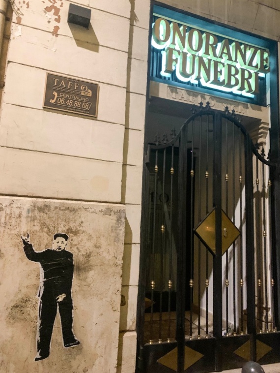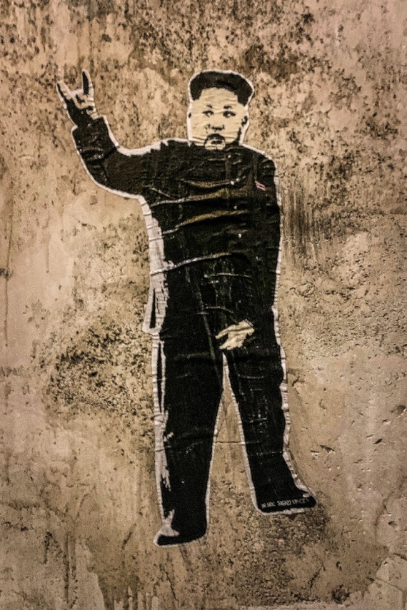 Dopo settimane in cui si vociferava la presunta morte di Kim Jong-un, il presidente coreano è riapparso in pubblico e la Street Artist romana ha deciso di ritrarlo nuovamente nella sua ultima irriverente opera.