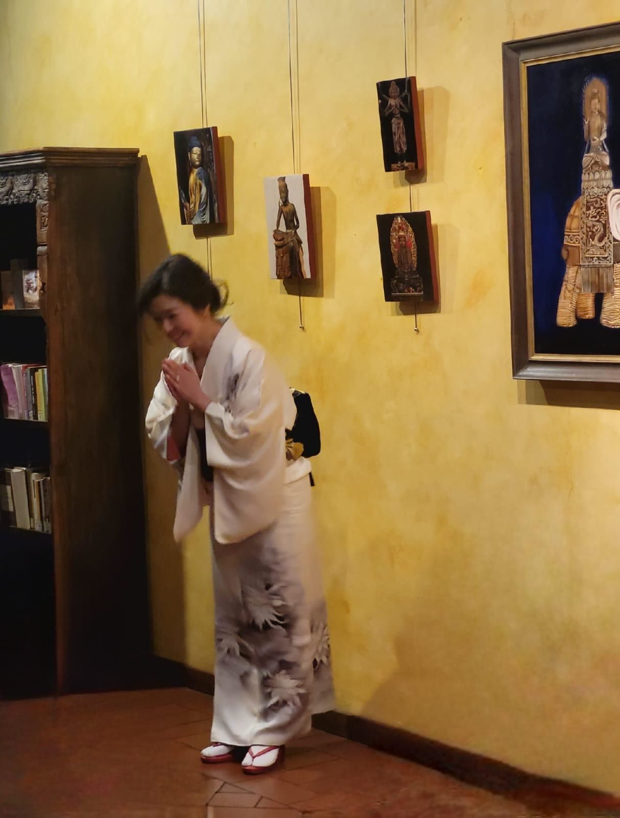 Michi Taguchi, nata e cresciuta a Kyoto e residente a Roma da circa venticinque anni, porta con sé una formazione profonda: dodici anni di studio della calligrafia alla scuola Nihonsuji, nella tradizione del maestro Kampō. Al vernissage ha accolto gli ospiti indossando un raffinato kimono, arricchito da un prezioso obi in seta con disegni floreali dorati, offrendo un’immagine autentica di eleganza e armonia.