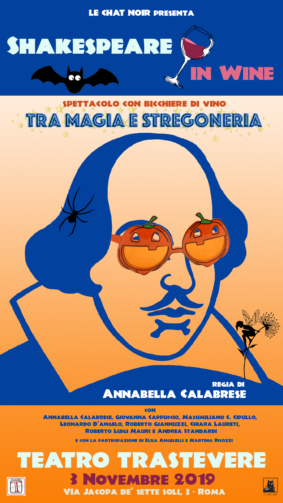 Il format Shakespeare in wine, ideato dall’attrice e regista Annabella Calabrese e portato in scena dalla Compagnia Le Chat Noir, reduci dalla recente vittoria al Roma Comic Off con CTRL Z- indietro di una mossa, nasce proprio dalla volontà di riportare ai giorni nostri l’atmosfera dell’epoca, coniugando la rappresentazione di diverse scene shakespeariane, riadattate e rivisitate in chiave moderna, con il momento dell’aperitivo, il tutto all’interno del caratteristico e scenografico Teatro Trastevere, situato nell’omonimo celebre quartiere.
