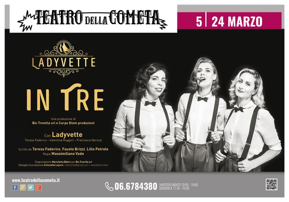 Dopo lo strepitoso successo della passata stagione, tornano al Teatro della Cometa dal 5 al 24 marzo, Teresa Federico, Valentina Ruggeri, Francesca Nerozzi ovvero Ladyvette con il nuovo spettacolo IN TRE, scritto a sei mani da Teresa Federico, Fausto Brizzi e Lillo Petrolo, per la regia di Massimiliano Vado.