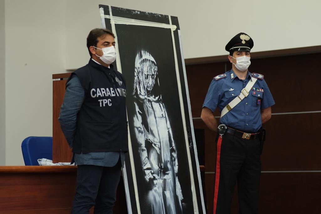 I Carabinieri della Compagnia di Alba Adriatica, unitamente ai colleghi del Nucleo Tutela Patrimonio Culturale di Ancona e alla Polizia Giudiziaria di Parigi, hanno, quindi, recuperato un dipinto realizzato da Banksy – pseudonimo di un maestro della “street art” di fama mondiale – su una porta di sicurezza del Teatro “Bataclan” di Parigi, in omaggio alle 130 vittime degli attacchi terroristici del 2015, 90 delle quali mietute proprio in quel locale il 13 novembre. Il dipinto, raffigurante una ragazza dolente, è diventato un simbolo del tragico evento e fu trafugato il 26 gennaio 2019.