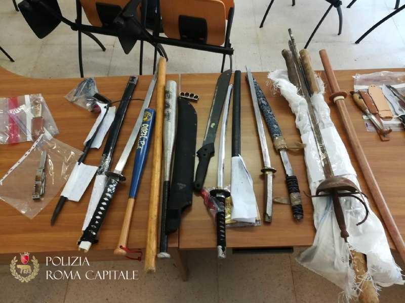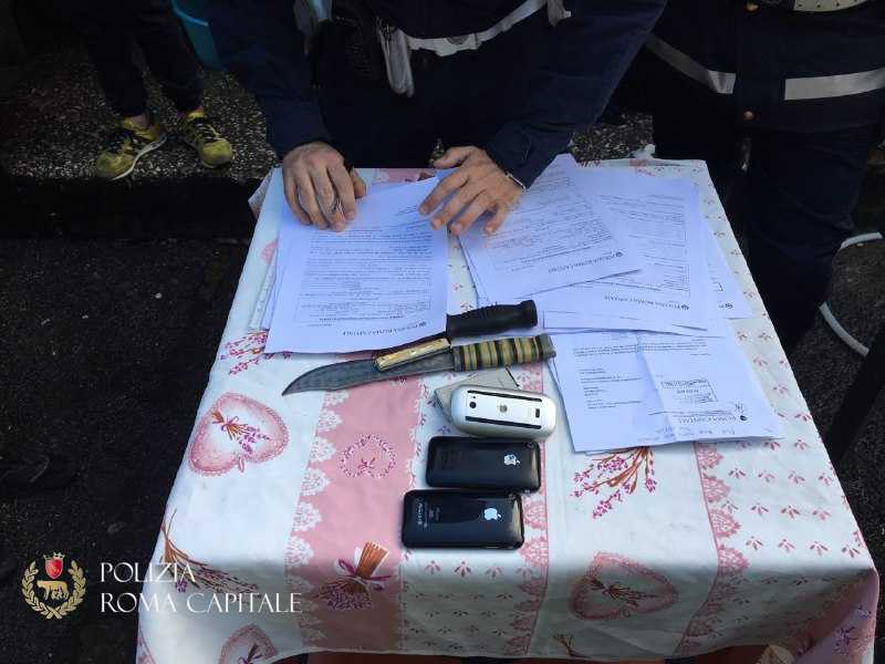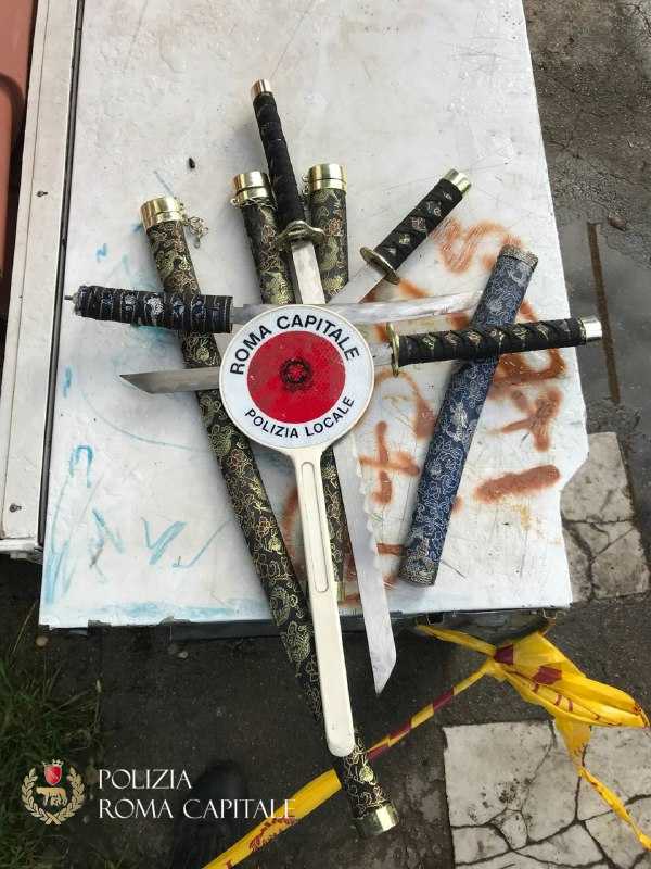 Oltre 50 armi da taglio, circa ventimila euro in banconote e numerosi oggetti di valore sono stati sequestrati dalla Polizia Locale di Roma Capitale nel campo nomadi di via Candoni, a conclusione dell’intervento iniziato all’alba di ieri mattina.