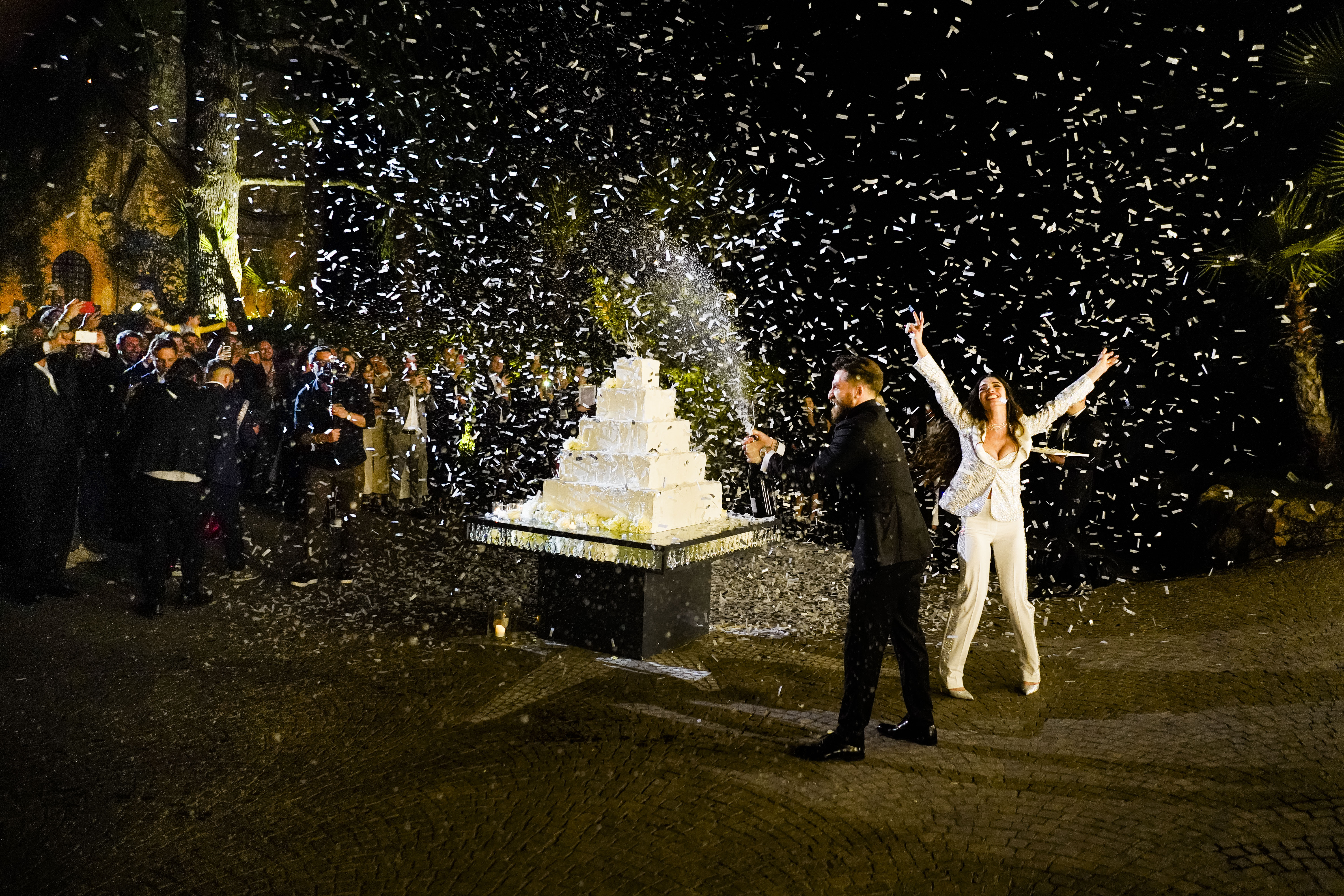 Nel tardo pomeriggio il blindatissimo Castello ha accolto l’aperitivo, la cena ed a seguire il taglio della torta nuziale con il party.