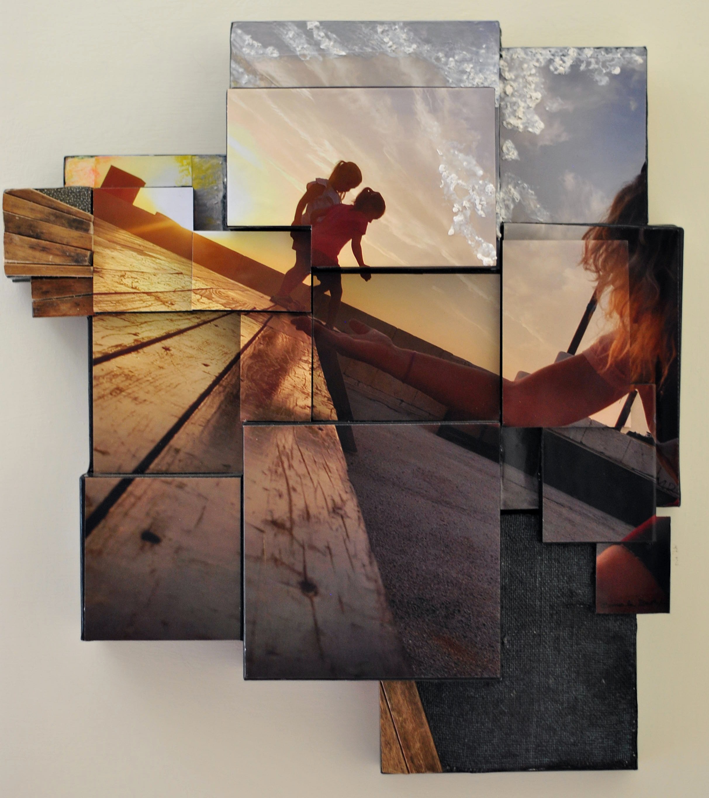Non sono frutto di maturazione. Prima di lavorare sulla fotografia volumizzata mi sono dedicata alla frammentazione degli oggetti. Gli oggetti frammentati venivano poi assemblati all’interno di un quadro prendendo una nuova essenza. Ancora oggi cammino per strada e quando la mia attenzione si concentra su un oggetto vicino ai cassonetti mi fermo, lo guardo e lo contemplo. Se nella mia immaginazione l’ho già trasformato me lo prendo e lo porto via. La stessa cosa avviene con la foto. L’altro giorno una signora mi ha portato due foto di suo figlio di cui una sulla moto. Io a livello emotivo non ho sentito nulla. Poi me ne ha mostrata un’altra in cui il figlio era girato di spalle con alcune persone sullo sfondo e in quel momento ho visualizzato il quadro.