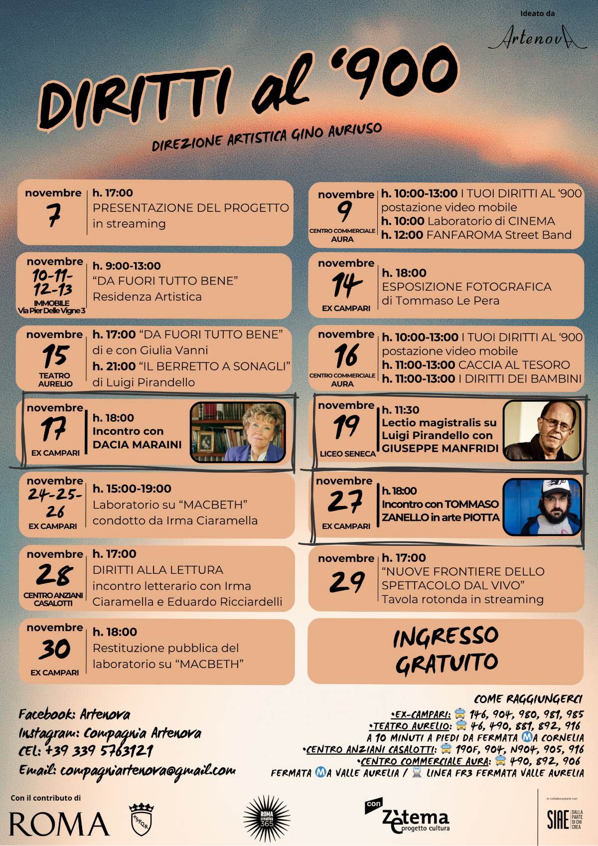 DIRITTI al ‘900, ideato dal direttore artistico di Artenova, Gino Auriuso, offre a pubblico e artisti un’occasione di sperimentazione e confronto sulle nuove frontiere cross-settoriali e multidisciplinari dello spettacolo dal vivo.