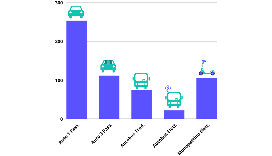 È evidente come in termini di emissioni di CO2, i mezzi più sostenibili siano quelli pubblici quali treni, tram e metro con emissioni di circa 6 g/km per persona, seguiti da autobus elettrici e tradizionali che sono rispettivamente 21 g/km e 74 g/km.