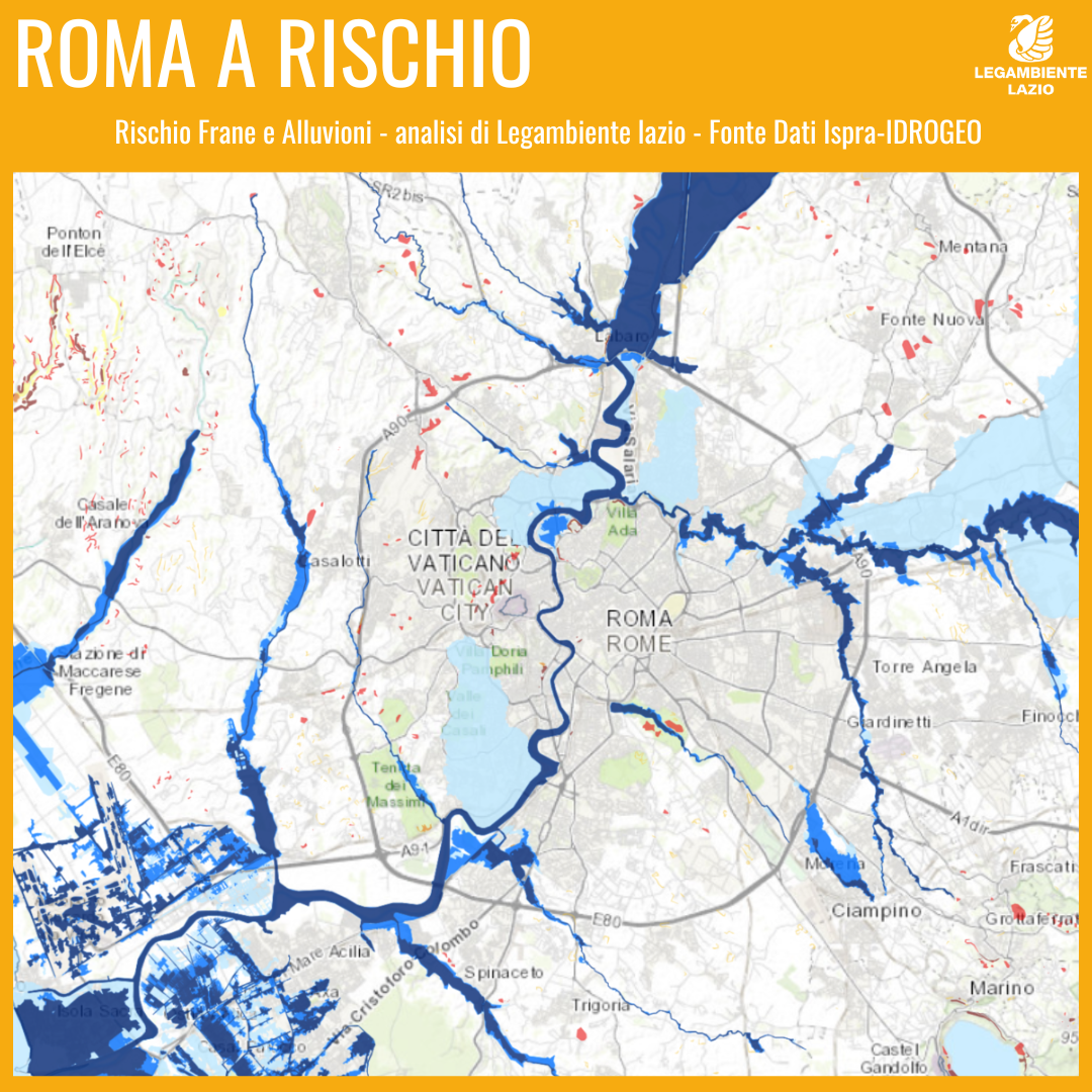 Nello studio, Legambiente ha focalizzato anche l’attenzione sui quartieri a più elevata pericolosità per il rischio alluvioni: nel quadrante sud-ovest Ostia, Acilia, Casal Palocco, Infernetto, Eur Torrino, Tor di Valle; a est Tiburtina e Prenestina; a nord Settebagni, Labaro, Salaria e Tiberina, nelle aree centrali il quadrante compreso tra Villaggio Olimpico, Corso Francia, Via Guido Reni. Zone con pericolosità per frane sono invece a Trastevere, Baldo degli Ubaldi, Monte Mario, Villa Glori, Viale Tiziano e Labaro. L’analisi di Legambiente Lazio è basata su dati ISPRA-IDROGEO.
