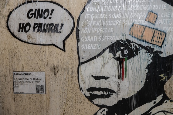 Nella notte del 15 Agosto, a Roma, in via Andrea Provana, all’angolo di via Biancamano, è apparsa una nuova opera della Street Artist Laika dal titolo: Le Lacrime di Kabul (Omaggio a Gino Strada).