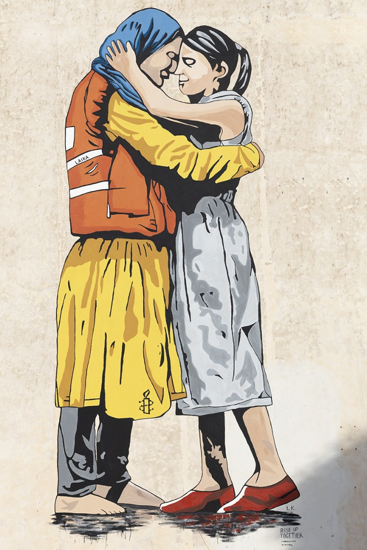 Il murale raffigura la commovente immagine di un abbraccio tra due donne, una lampedusana e una persona migrante. L’opera vuole trasmette un messaggio di straordinaria potenza, ovvero quello della forza e della generosità dei cittadini e delle cittadine di Lampedusa nell’accogliere le persone migranti. Il murale di Laika si eleva come un tributo sentito all’isola e a tutti coloro che, nel corso degli anni, si sono prodigati per soccorrere chi, con grandi difficoltà, ha cercato di raggiungere l’isola via mare.