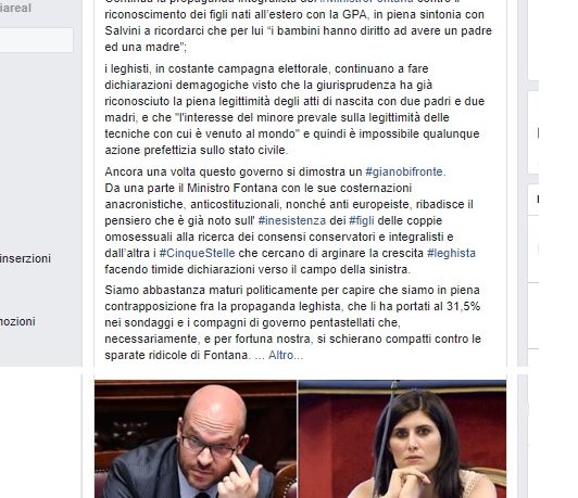 Da una parte il Ministro Fontana con le sue costernazioni anacronistiche, anticostituzionali, nonché anti europeiste, ribadisce il pensiero che è già noto sull’ #inesistenza dei #figli delle coppie omosessuali alla ricerca dei consensi conservatori e integralisti e dall’altra i #CinqueStelle che cercano di arginare la crescita #leghistafacendo timide dichiarazioni verso il campo della sinistra.