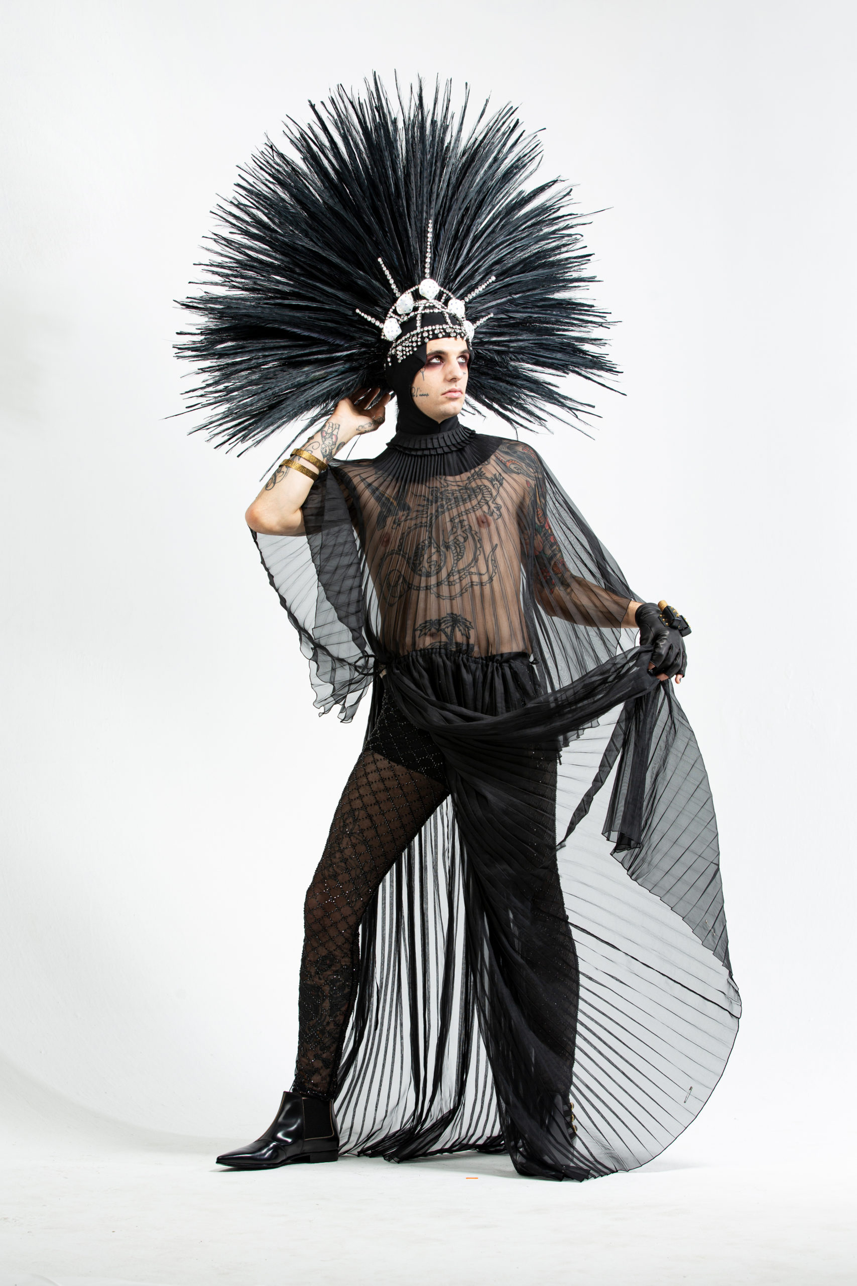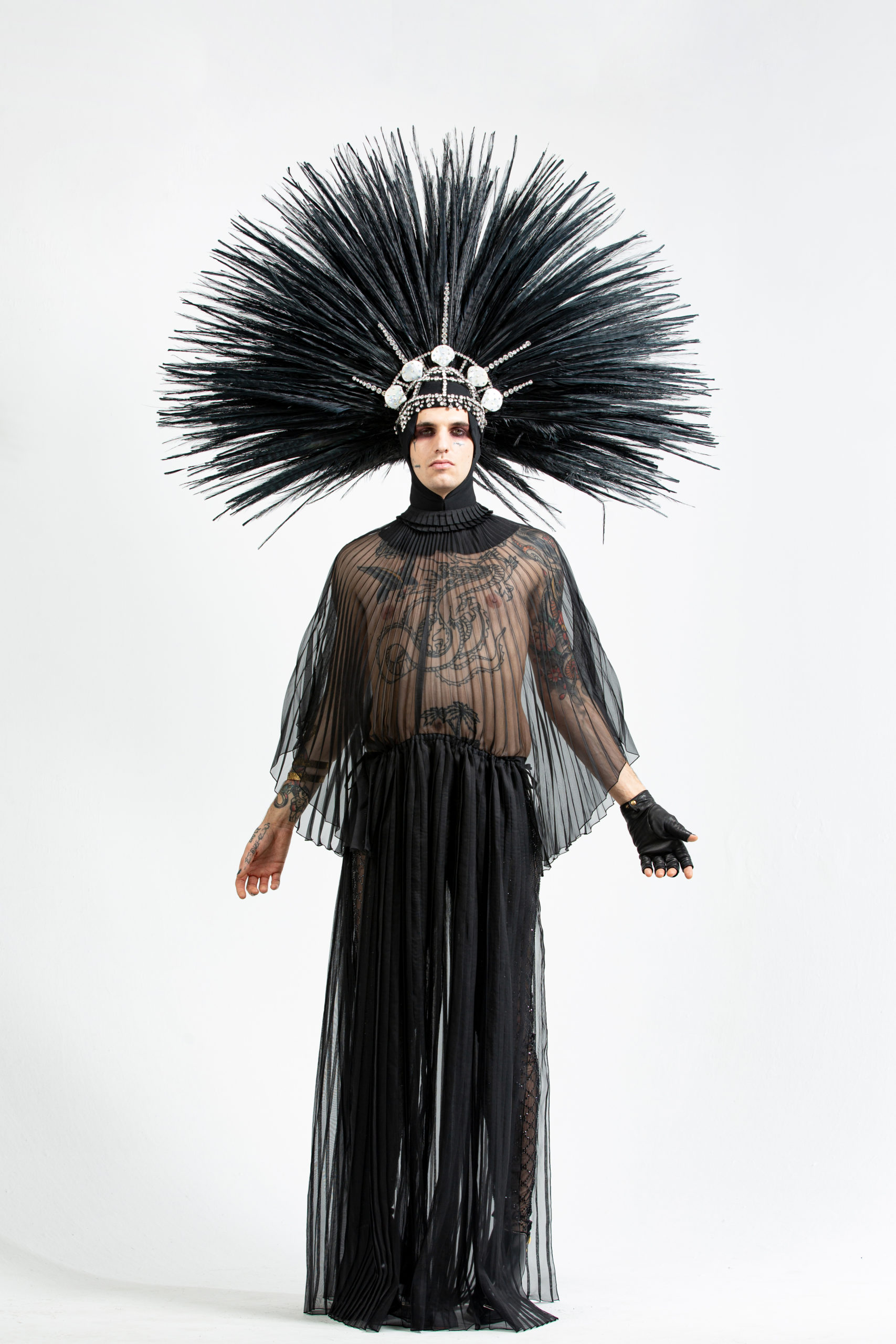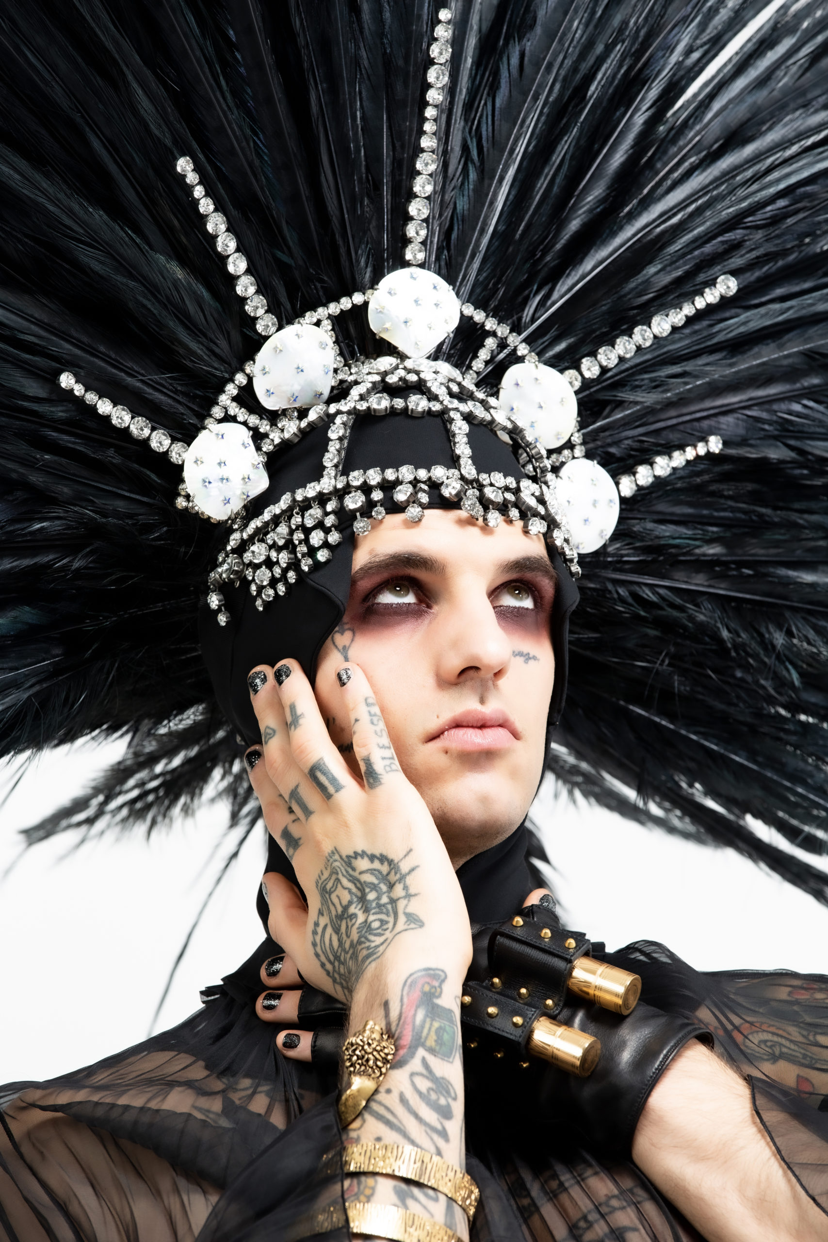 In testa, uno scenografico copricapo di piume con inserti di cristalli.