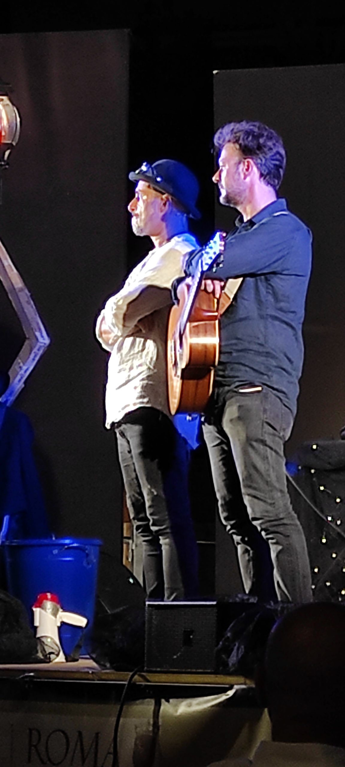 Ma non è tutto, perché in questo spettacolo c’è anche posto per l’attore che è in lui. Si presenta al pubblico entrando in scena con un megafono, in maniera originale e simpatica; non a caso il primo brano che esegue è “Je so’ pazzo” di Pino Daniele… Bravo lui e il chitarrista che lo accompagna, Pino Iodice, sempre in perfetta sinergia. Entrambi costruiscono armonie ed arrangiamenti con gusto e professionalità.