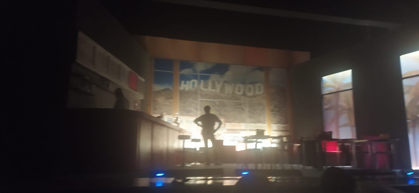 Lo spettacolo è un susseguirsi infinito di citazioni di attori, film, registi che le musiche azzeccate in sottofondo accompagnano sapientemente. Bella la scenografia in cui si muovono i nostri: un fast food ricreato alla perfezione con tanto di porta d’uscita da cui si intravedono realistiche palme con attigua strada pubblica, ed un finestrone che incornicia la famosissima montagna su cui campeggia la nota scritta “Hollywood”. Siamo dunque nella città che rappresenta il successo, il sogno americano ma anche, come in questo caso, il fallimento.
