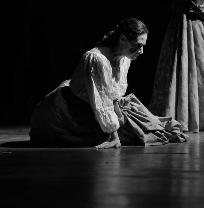 Giovanna con movenze, espressività, sguardi pietosi, tonalità di voce strozzata e sofferta che poi trasforma in una nenia ipnotica, monotona e ripetitiva.