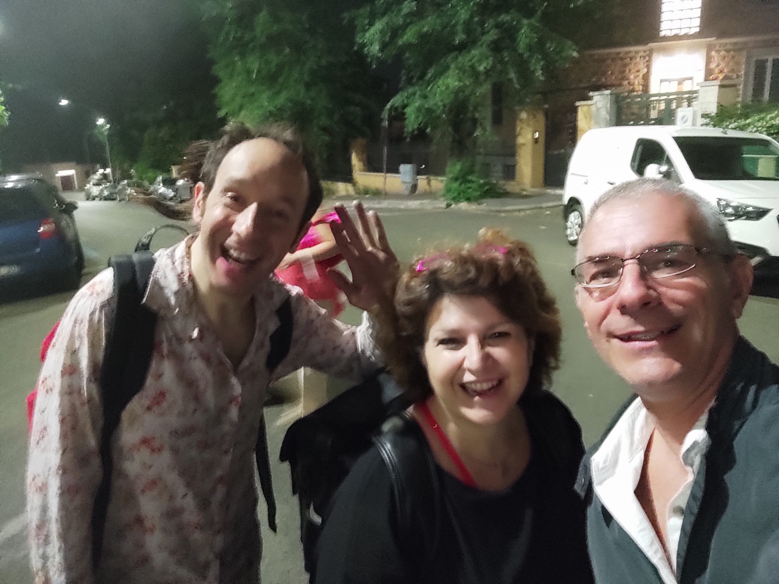 Tra gli spettatoti c’erano volti noti tra cui Amedeo D’Amico e Alessandro Partexano, con i quali mi sono intrattenuto a parlare amabilmente. Alessandro mi ha raccontato delle sue esperienze artistiche. Ormai da quarant’anni a Roma, ha lavorato con grandissimi artisti. Con molta gentilezza ha voluto condividere con me i suoi ricordi di incontri, esperienze ed aneddoti personali e di artisti del calibro di Manfredi, Montesano, Proietti ed altri ancora, con i quali ha avuto la fortuna di lavorare, crescere e formarsi. Oggi conosciamo bene la bravura di questo veterano dello spettacolo, così come quella di Amedeo.