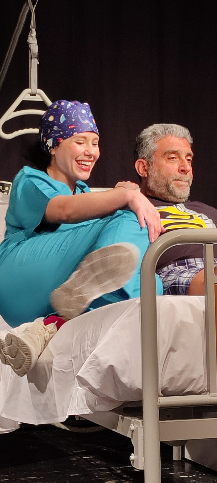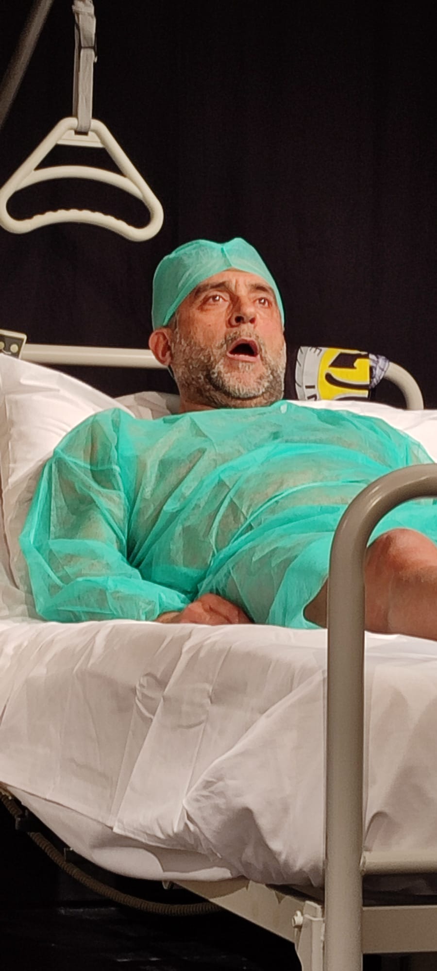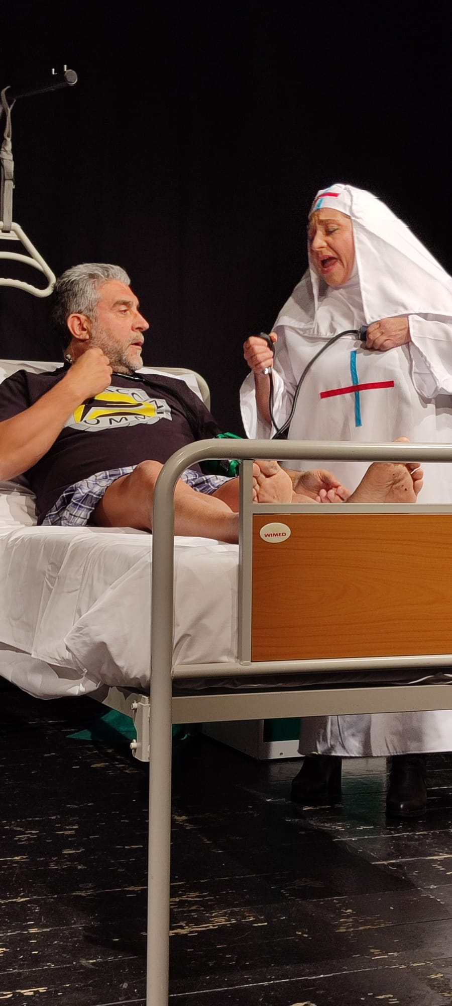 Ecco, allora, che il Teatro Portaportese si trasforma nella giusta location per questa storia. La scenografia ripropone la corsia di un ospedale nei suoi dettagli con i letti, i separé, i comodini, gli strumenti per ogni esigenza dei pazienti e perfino la mappa della struttura con le vie di fuga in caso di evacuazione. E poi il quadretto con la Madonnina e il cartello che indica il wc…