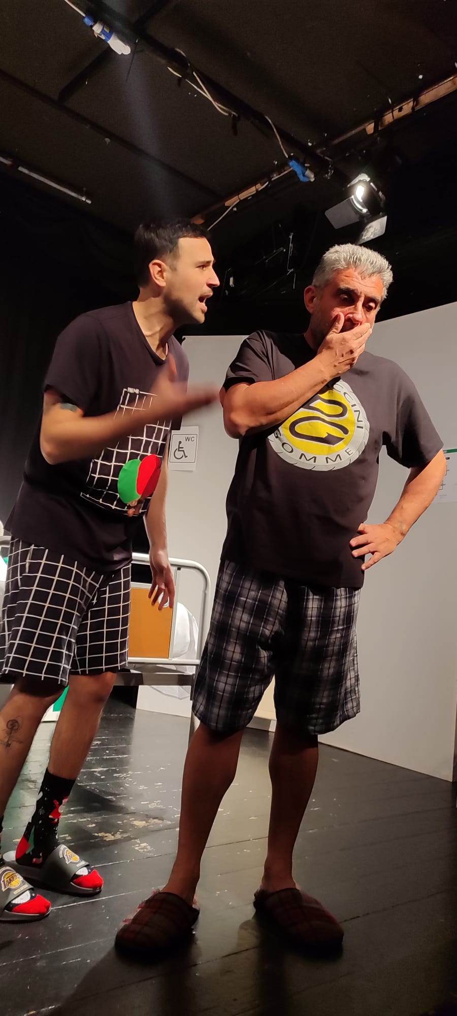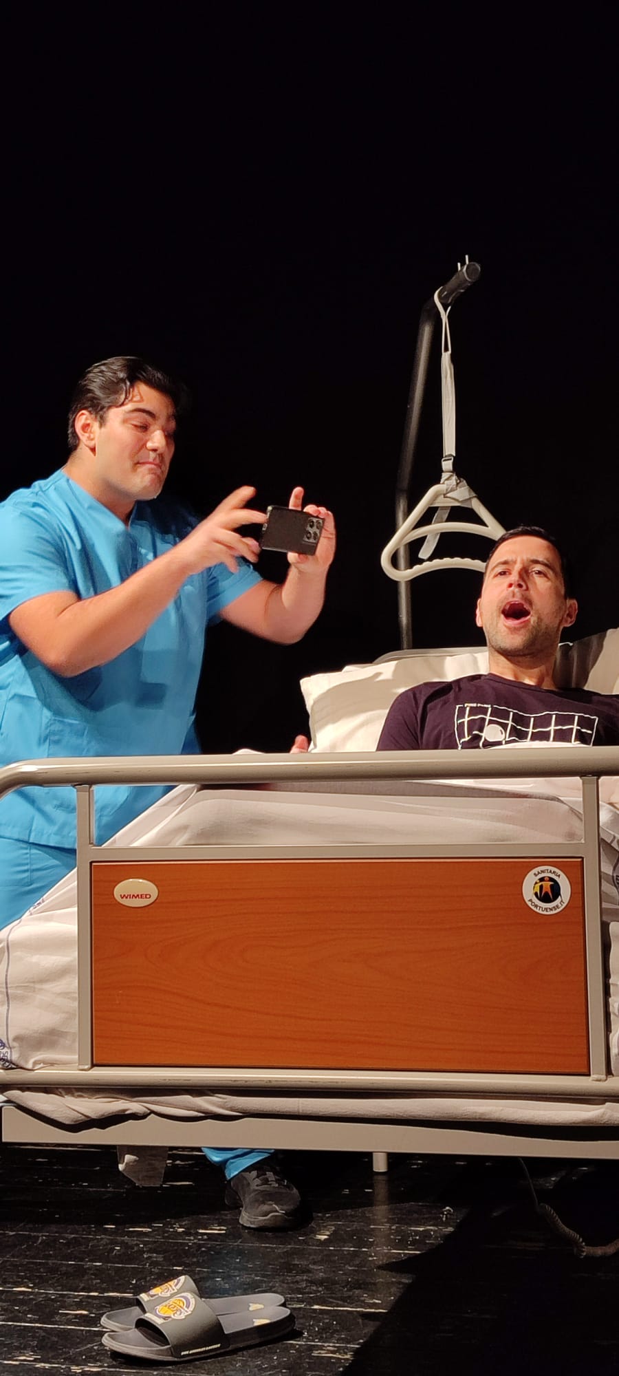 Intanto si palesa subito l’ inevitabile scontro generazionale tra i due pazienti a causa degli opposti punti di vista nei riguardi della vita, in cui si inserisce efficacemente l’imberbe portantino. Le loro discussioni coinvolgono con un effetto corale il pubblico più o meno giovane che, come sul palco, attraverso il linguaggio diverso si immedesima con l’una o l’altra parte. Il risultato è un mix irresistibile di battute riuscite e fulminanti che funzionano piuttosto bene.