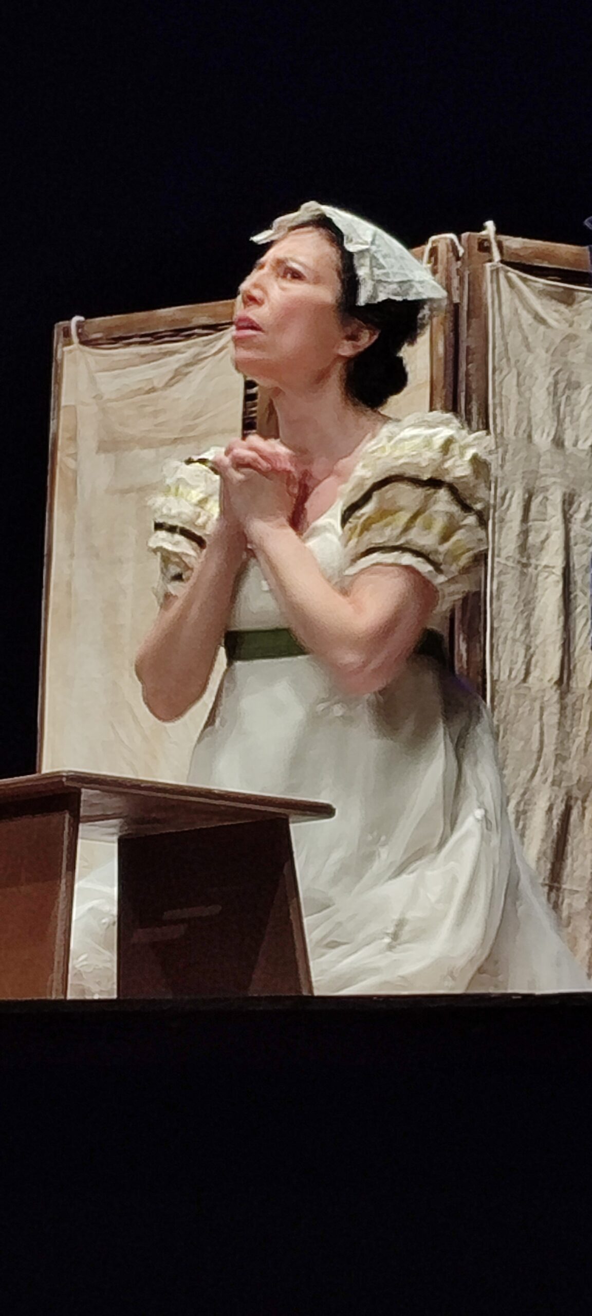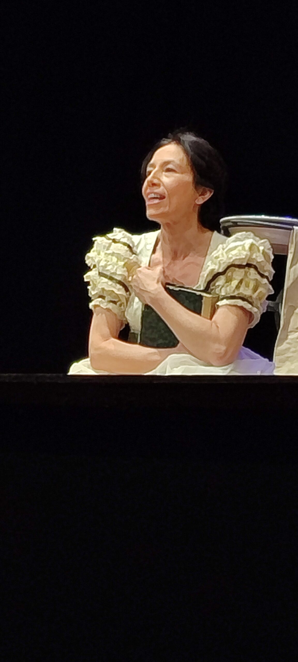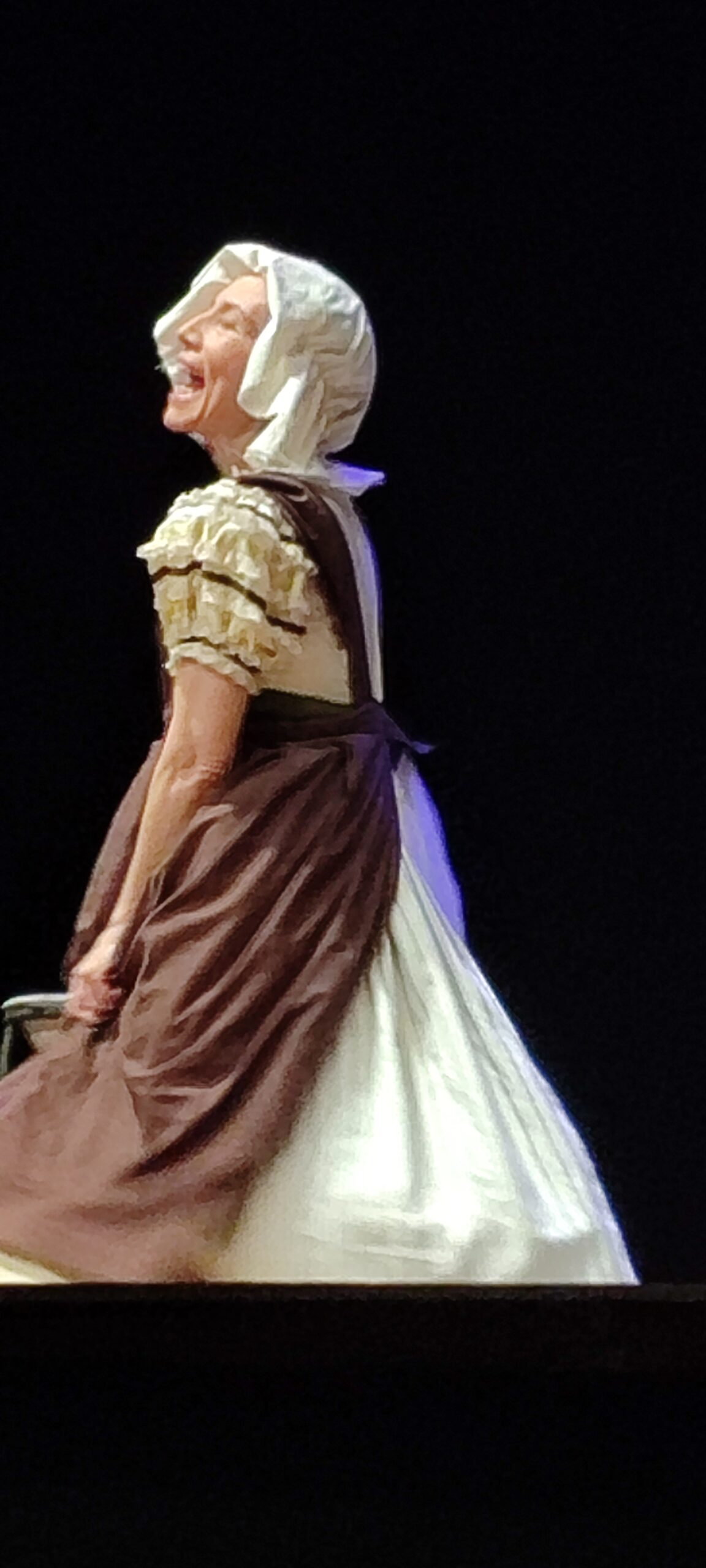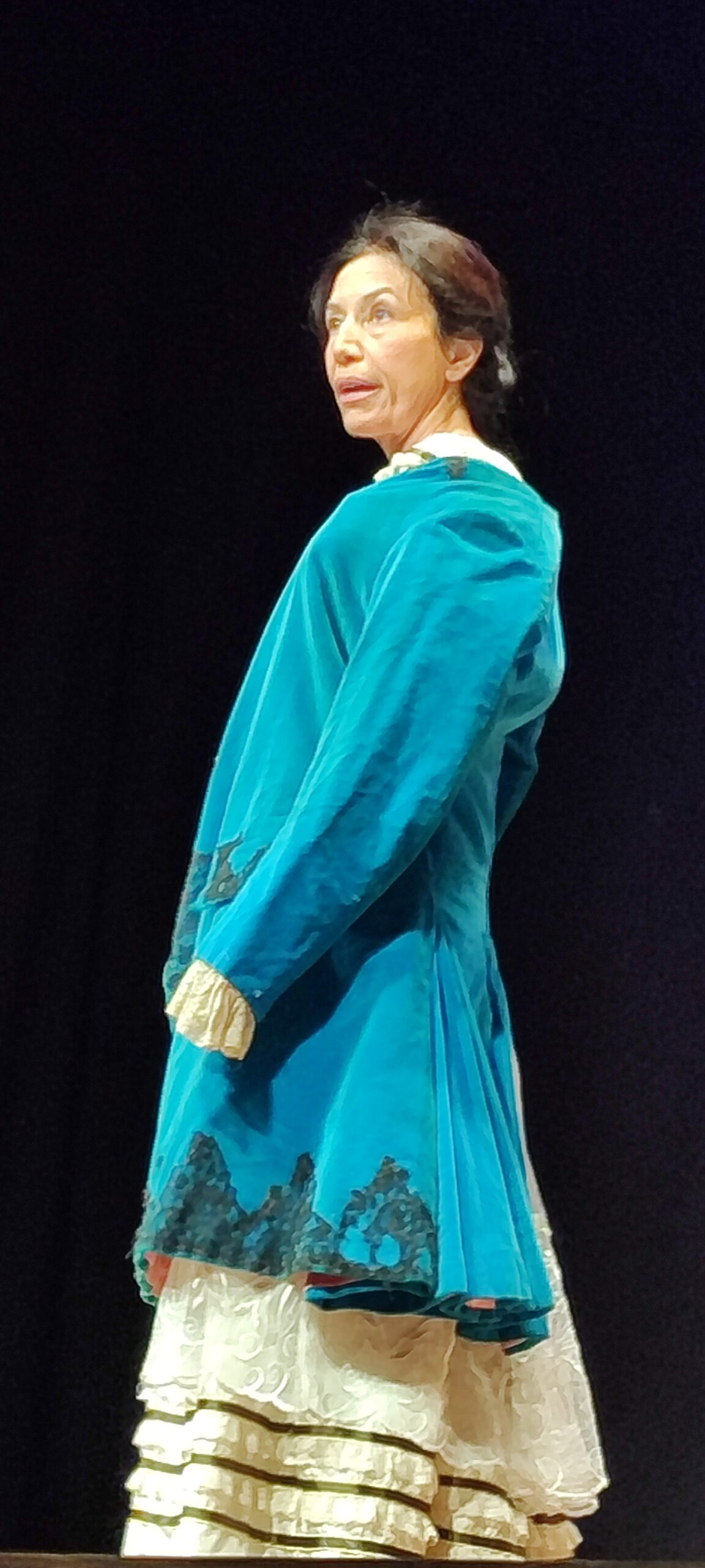 Lo farà dando vita ad una pletora di personaggi riuscitissimi, alcuni nobili spocchiosi e alteri, altri semplici e rozzi popolani. Un cappello, una giacca, un grembiule e una cuffia trasformeranno l’attrice di volta in volta mentre la voce cambia insieme al tono e alla mimica.