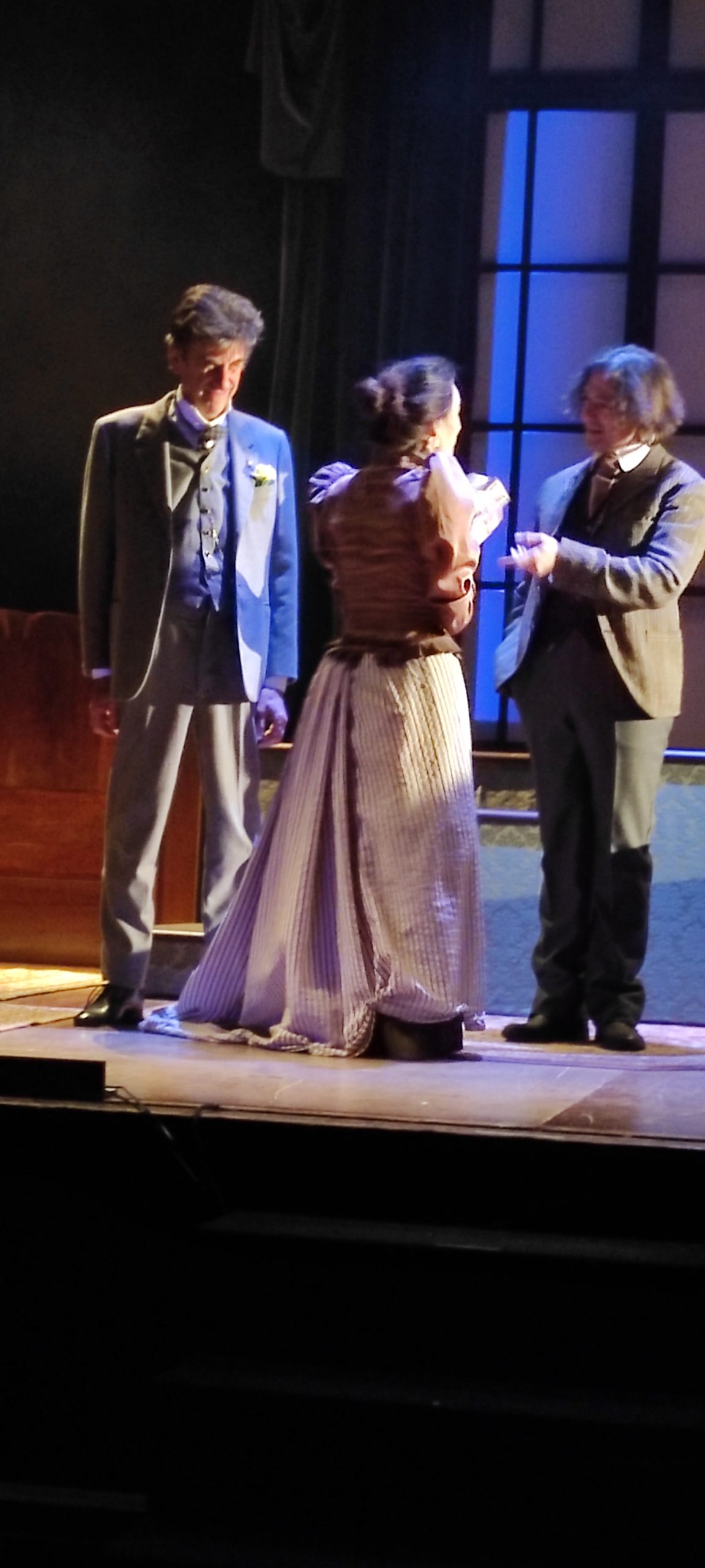 Un ottimo spettacolo ben recitato, con costumi raffinati ed azzeccati; bella l’idea dell’uso delle luci che irrompono in quel buio onnipresente, spiragli di luce che sembrano lampi di speranza che vorrebbero rompere quella falsità imperante. Forse da migliorarne l’uso per dare ancora di più risalto alla vicenda. Ho avuto la sensazione che a volte non riuscissero a centrare i personaggi, celandone così l’intensità espressiva. Interessante ed azzeccato il vocio e gli schiamazzi fuori scena accompagnati dalle musiche, che riempiono il vuoto dei cambi scena.