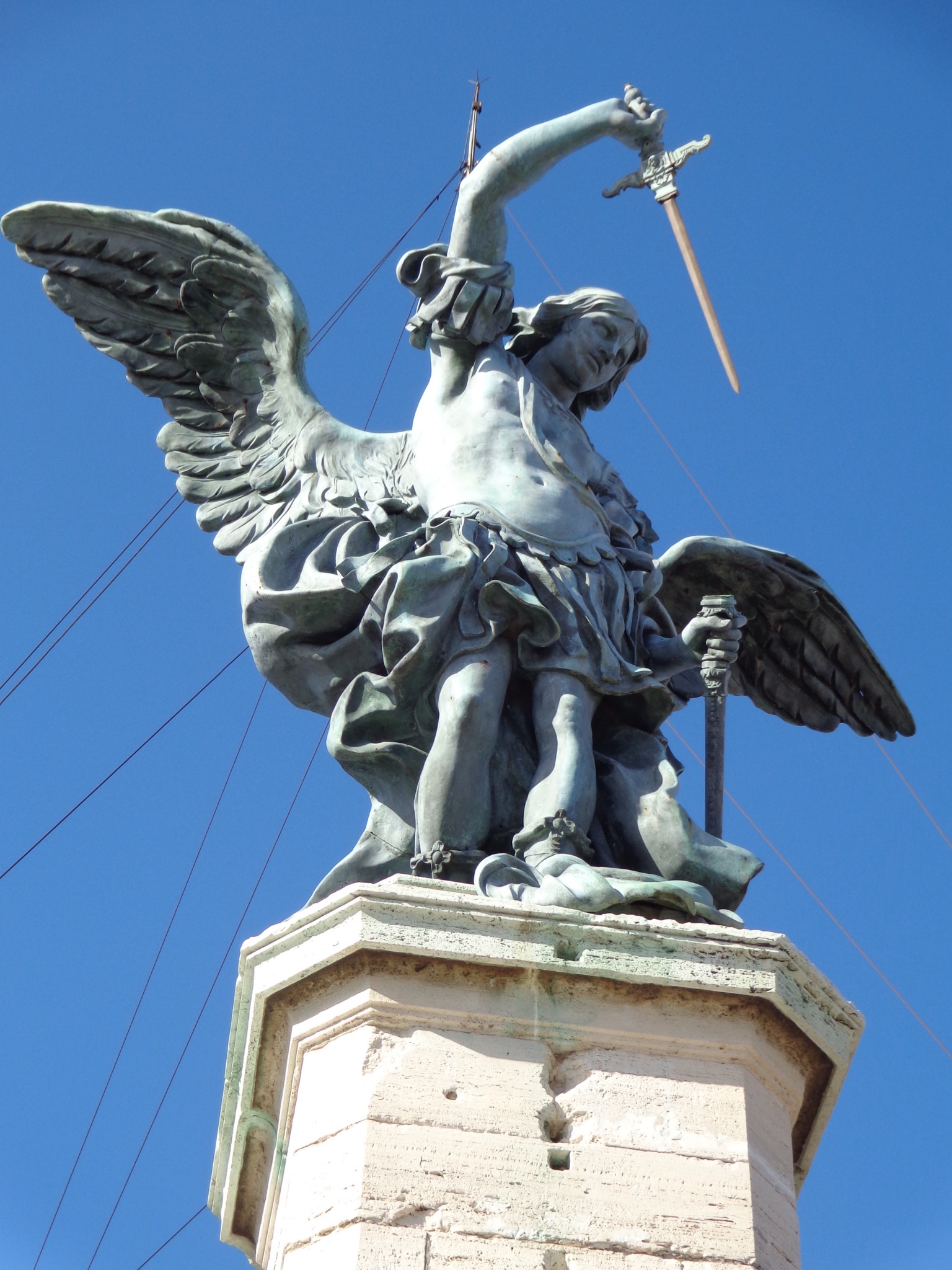 Per ricordare tale avvenimento fu scolpito sulla sommità del castello l’angelo così come apparve alla folla. L’angelo del castello attuale non è l’originale anche se è ugualmente maestoso ed imponente con il suo corpo in bronzo che raggiunge 5 metri di altezza e un’apertura alare di circa 6 metri. Ai Musei Capitolini è conservata una curiosa pietra ove si dice sia incisa l’impronta che l’Arcangelo Michele lasciò atterrando dal cielo per porre fine alla pestilenza.