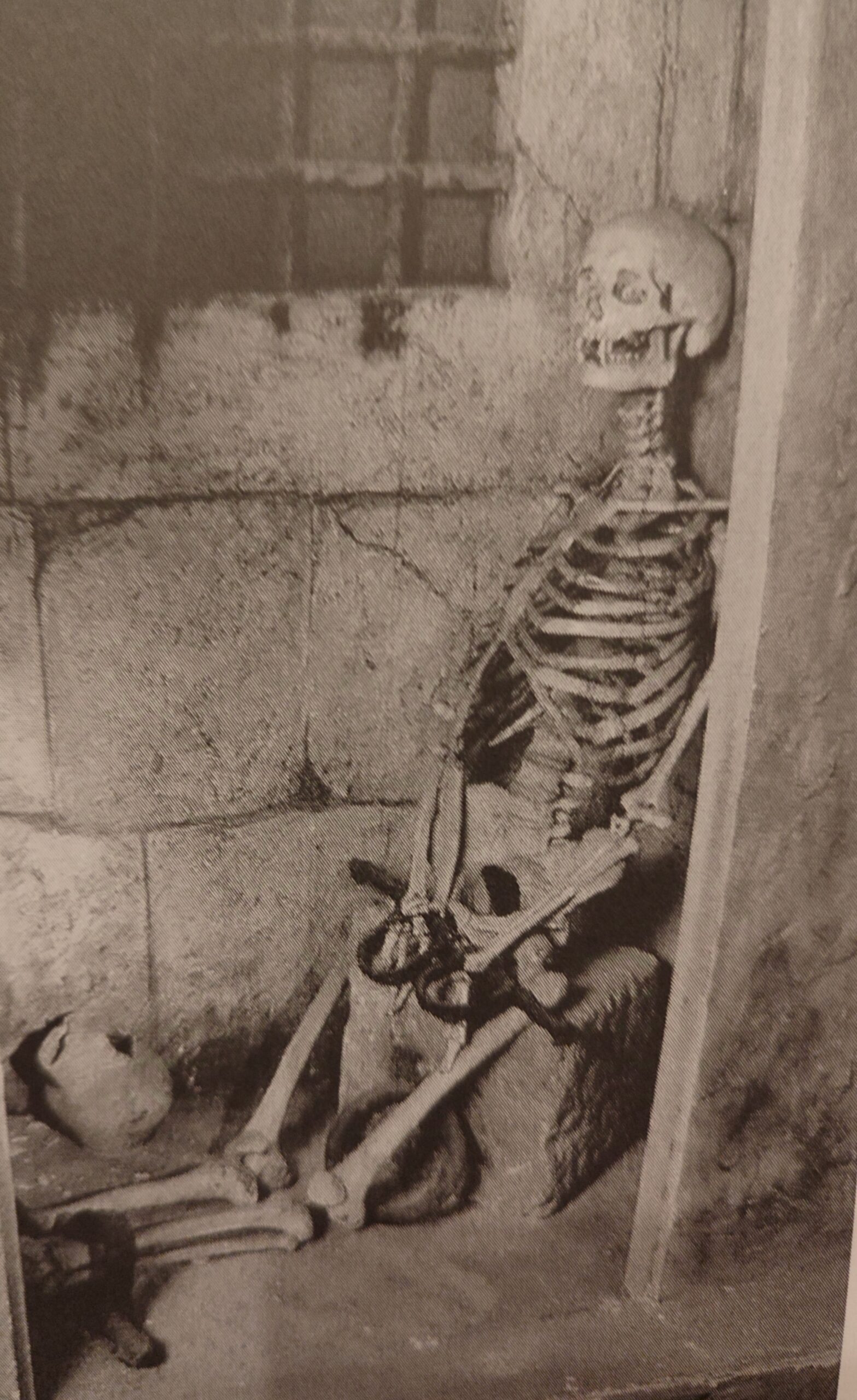 Sotto le macerie venne trovato uno scheletro con caviglie e polsi bloccati da ferri di contenimento, seduto su un ceppo in pietra e appoggiato al muro. Vicino aveva una brocca scheggiata ed una lampada ad olio. Lascia perplessi che la calce delle mura e l’isolamento anaerobico non abbia restituito un corpo in condizioni conservative migliori.